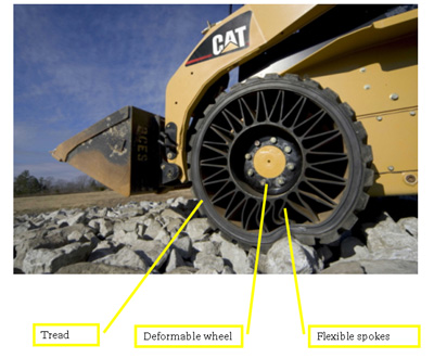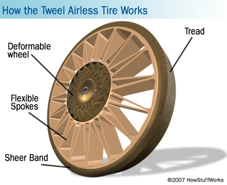 The flexible spokes are fused with a flexible wheel that deforms to absorb shock and rebound with ease. Without the air needed by conventional tires, Tweel still delivers pneumatic-like performance in weight-carrying capacity, ride comfort, and the ability to "envelope" road hazards.