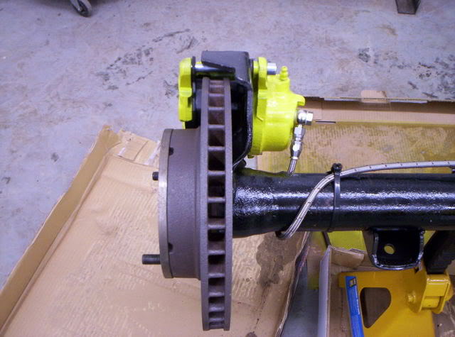 iused the stock front caliper brackets, enlarged the hole to fit over the bearing bulge, cut a notch to clear the axle tube, then slid into place. like the other poster has said, i cut down the backing plate to be a spacer. i then mocked it all together to get the position for the bracket, tacked it on, disasembled then welded out.